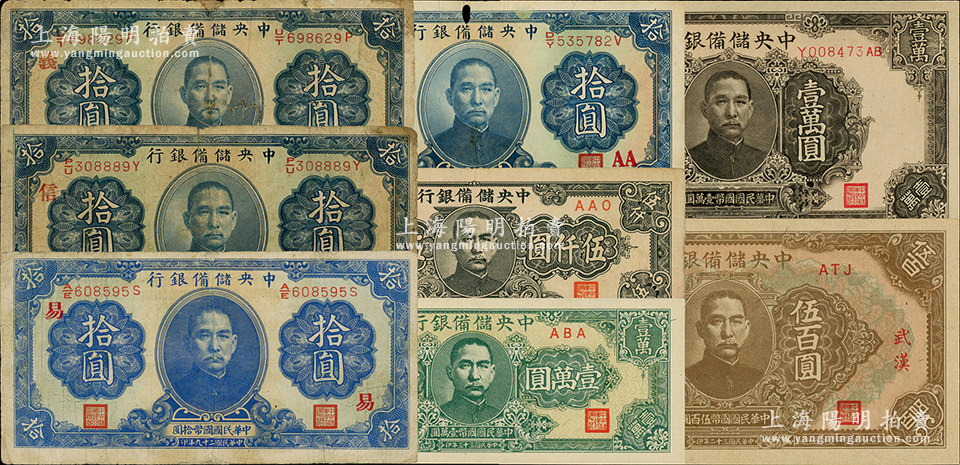 中央储备银行纸币藏品集1册共65枚,内含各种版式,详分:1940年第一版拾圆双面号加“易”字,第二版拾圆单面号加领券“信”、“义”、“陆”、“置”、“205”、“239”、“AA”、“Q”字,黑签名拾圆2枚、蓝签名拾圆3枚;1942年壹百圆2枚、小广东伍百圆;1943年拾圆、绿壹百圆2枚、蓝壹百圆3枚、长框长号伍百圆不同版式4枚、无底纹伍百圆3枚、长框短号伍百圆2枚、广东伍百圆6枚、武汉伍百圆2枚、短框伍百圆2种;1944年壹百圆、贰百圆2枚、长框长号壹仟圆、长框短号壹仟圆7枚、短框壹仟圆、褐色壹万圆、绿色长框壹万圆2枚、短框壹万圆、狭长版壹万圆;1945年长号伍仟圆、短号伍仟圆4枚、狭长版伍仟圆;日本藏家出品,五至九五成新,值得细览
