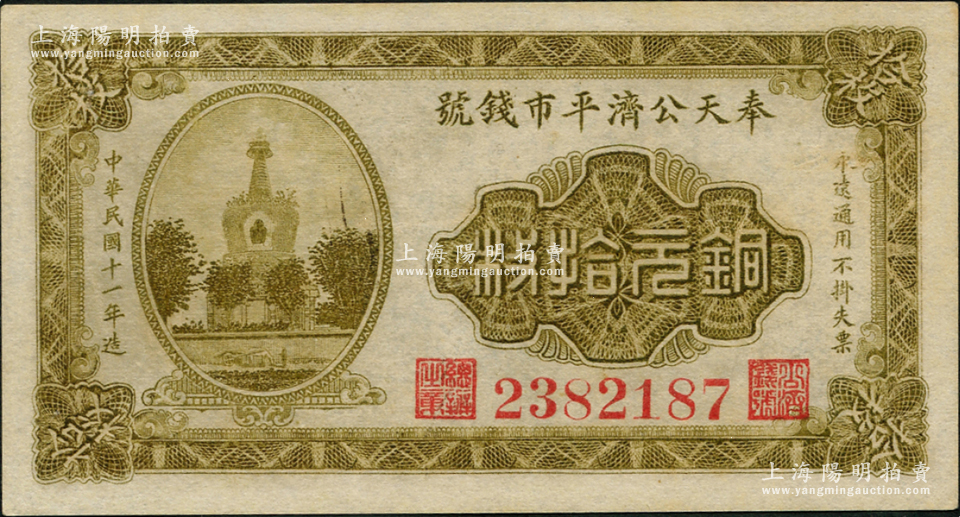 民国十一年(1922年)奉天公济平市钱号铜元拾枚,无字轨,九五成新