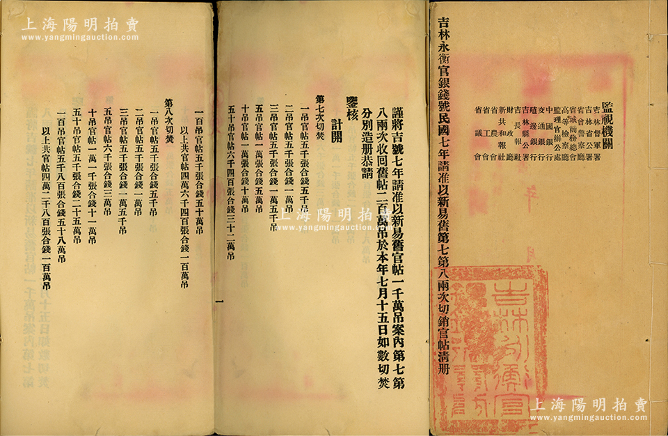 1918年《吉林永衡官银钱号民国七年请准以新易旧第七第八两次切销官帖清册》1份,内中详细记录两次切焚官帖200万吊之各面额券明细数目,且由吉林督军署、省公署、省会警察厅、省城商务总会、高等检察厅、中国银行、交通银行、殖边银行等16家机构会同监视;此清册对研究吉林永衡官银钱号纸币史极富参考价值,保存甚佳,敬请重视