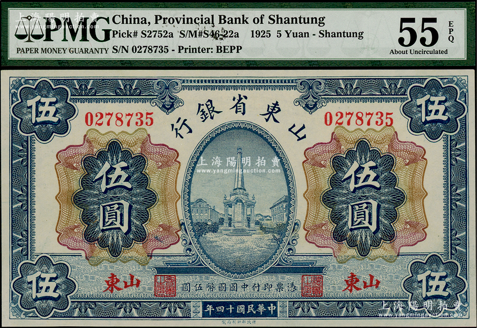 民国十四年(1925年)山东省银行财政部版伍圆,山东地名,PMG AU 55 EPQ