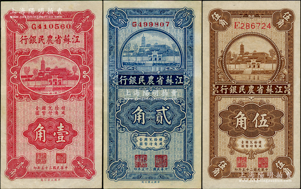 民国二十五年(1936年)江苏省农民银行大业版壹角、贰角、伍角共3枚不同,均上印苏州报恩寺塔,且背印赵棣华英文签名,八五至九五成新,敬请预览
