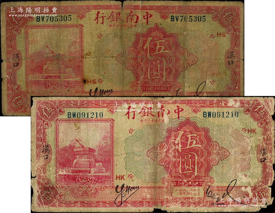 民国十六年(1927年)中南银行红色伍圆共2枚,均为汉口地名,分别加印领券HK和HS;海外藏家出品,六成新,敬请预览