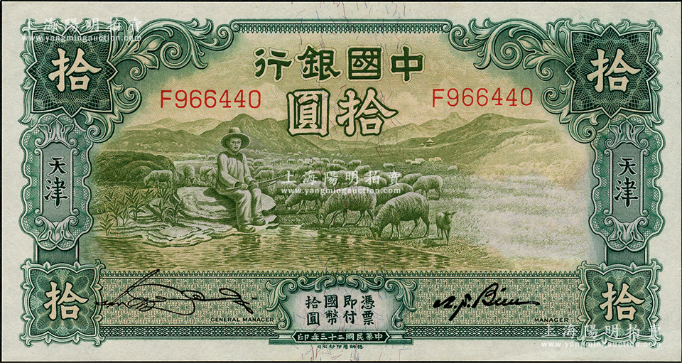 民国二十三年(1934年)中国银行牧羊图拾圆,单字轨,天津地名,宋汉章·卞寿孙签名,九八成新