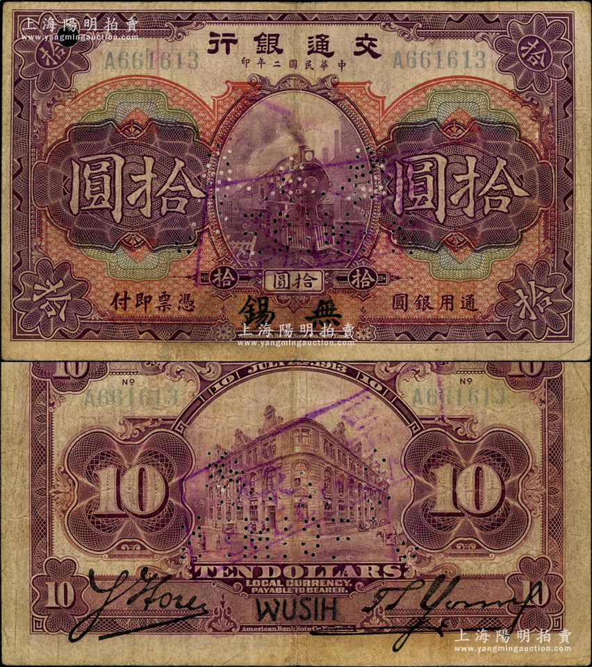 民国二年(1913年)交通银行拾圆正票改作票样,少见,下边有修补,七五成新