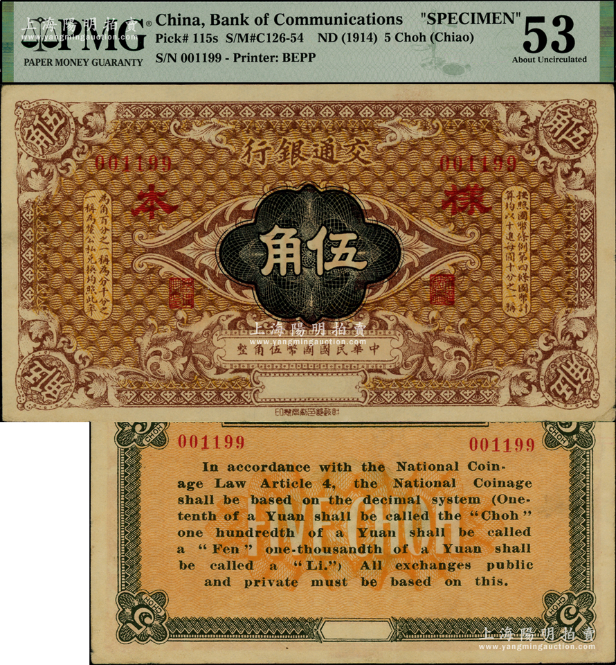 交通银行(1914年)国币伍角样本券,属深色版(注:此钞共分2种颜色,敬请留意背面颜色之明显差异),PMG 53 AU