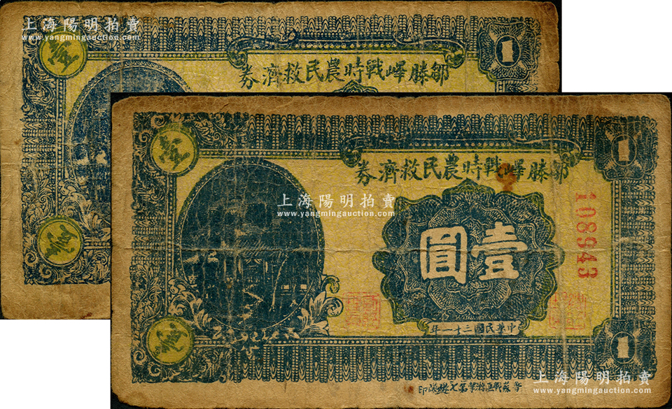 民国三十一年(1942年)邹滕峄战时农民救济券壹圆共2枚不同,分别为5位数和6位数号码券,其正面下边印有“鲁苏战区游击第七纵队印”字样,属抗战时期山东地方武装申宪周部所发行;日本回流品,少见,原票七成新