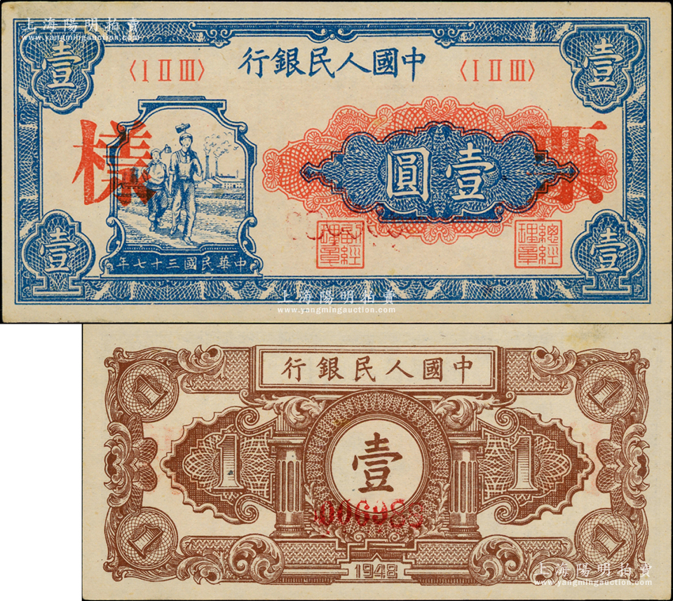 第一版人民币“工农图”壹圆票样,正背面合印,背面票样号码第006988号属少见之“大号码版”,原票未折九五成新,敬请关注