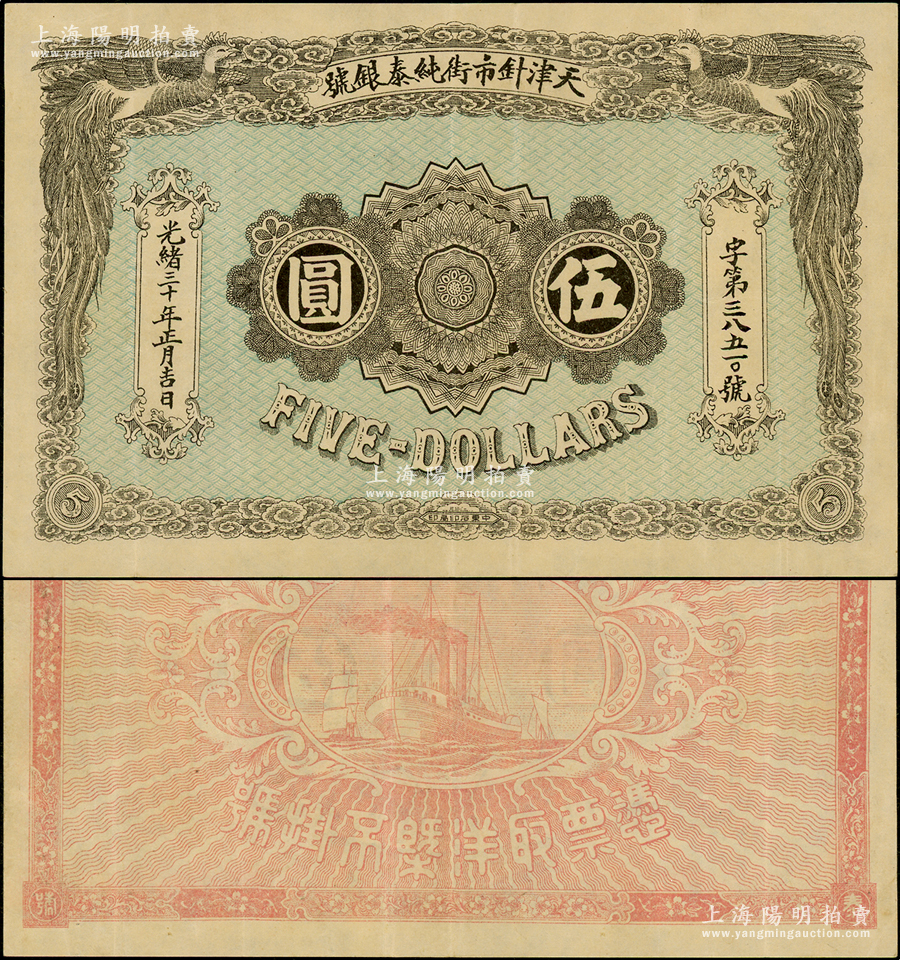 光绪三十年(1904年)天津针市街纯泰银号伍圆,上印双凤图,背印轮船帆船图;海外回流品,罕见,纸张硬挺,原票八成新