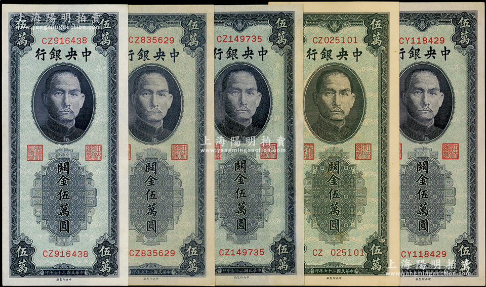 民国三十七年(1948年)中央银行关金中央厂蓝紫色伍万圆共5枚,内含CY、CZ0、CZ1、CZ8、CZ9字轨各1枚,其中CZ字轨属历史同时期之老假票(附有藏家批示);温天源先生藏品,均品相甚佳,九五至九八成新,敬请预览