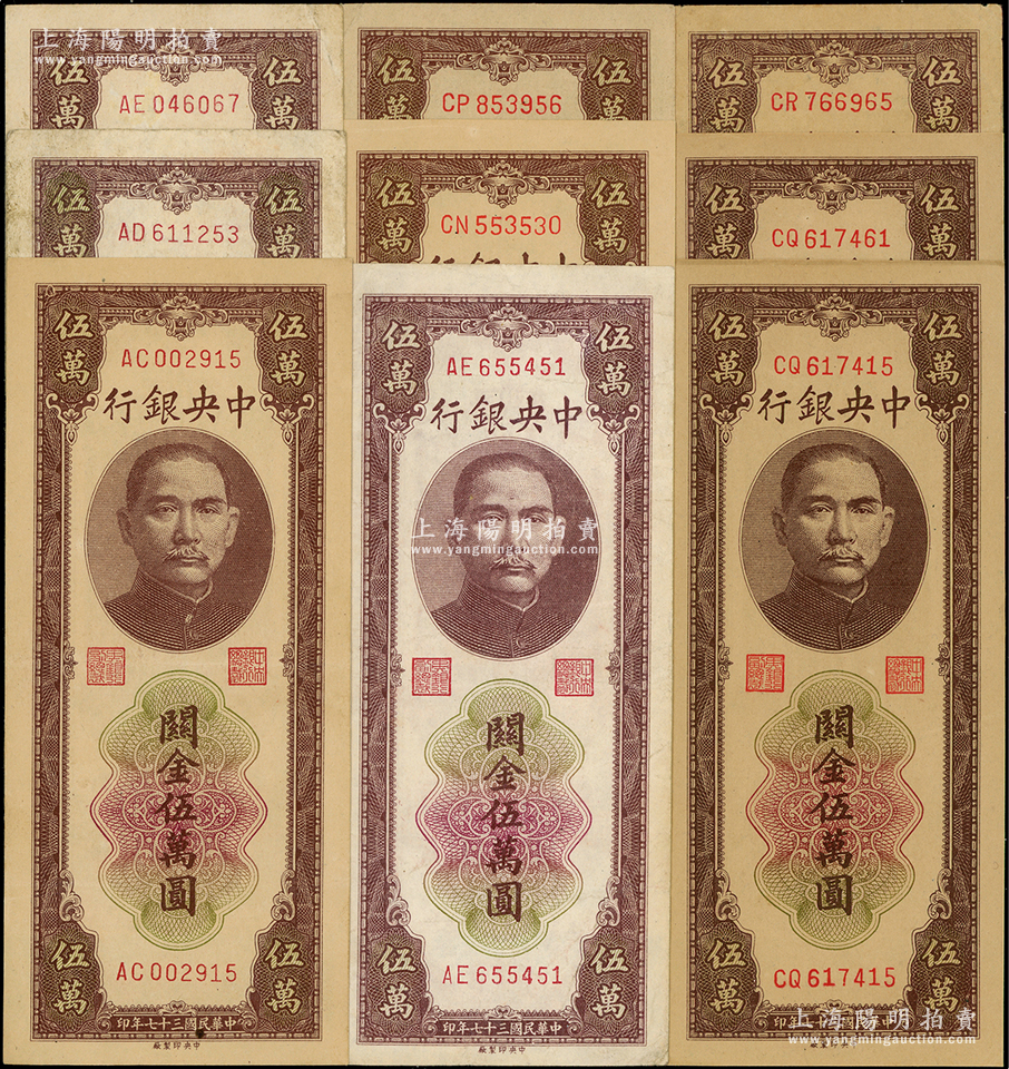 民国三十七年(1948年)中央银行关金中央厂棕色伍万圆共9枚,内含AC、AD、AE、CN、CP、CQ、CR字轨(内有2枚重复),且号码亦有大小之分;温天源先生藏品,其中5枚为七至八成新、1枚九成新、3枚为九五至全新,敬请预览