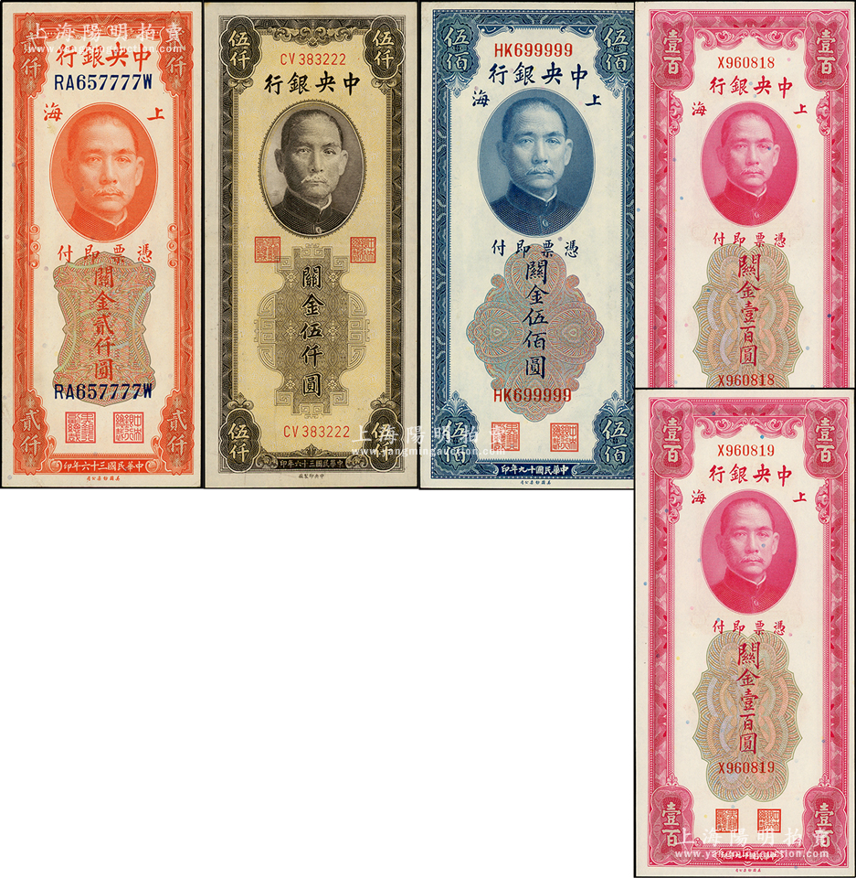 中央银行关金“小趣味号”共5枚,详分:美钞版1930年壹百圆单字轨2枚连号倒置号、1930年伍佰圆尾号99999老虎号、1947年贰仟圆尾号7777狮子号,中央厂1947年棕色伍仟圆尾号222豹子号;资深藏家出品,原汁原味,九八至全新