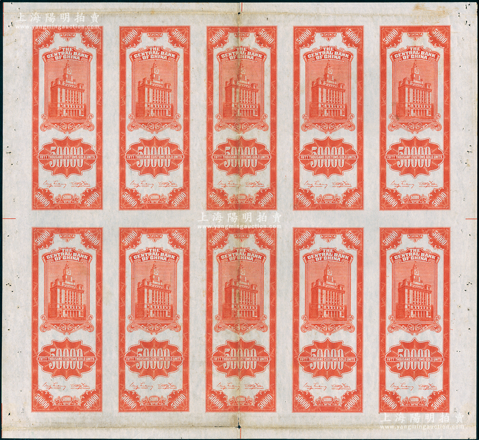 1948年中央银行关金中央厂桔色伍万圆试印票整版共10枚联体,均仅有背面,但其正面均印有底纹;资深藏家出品,八五至九成新