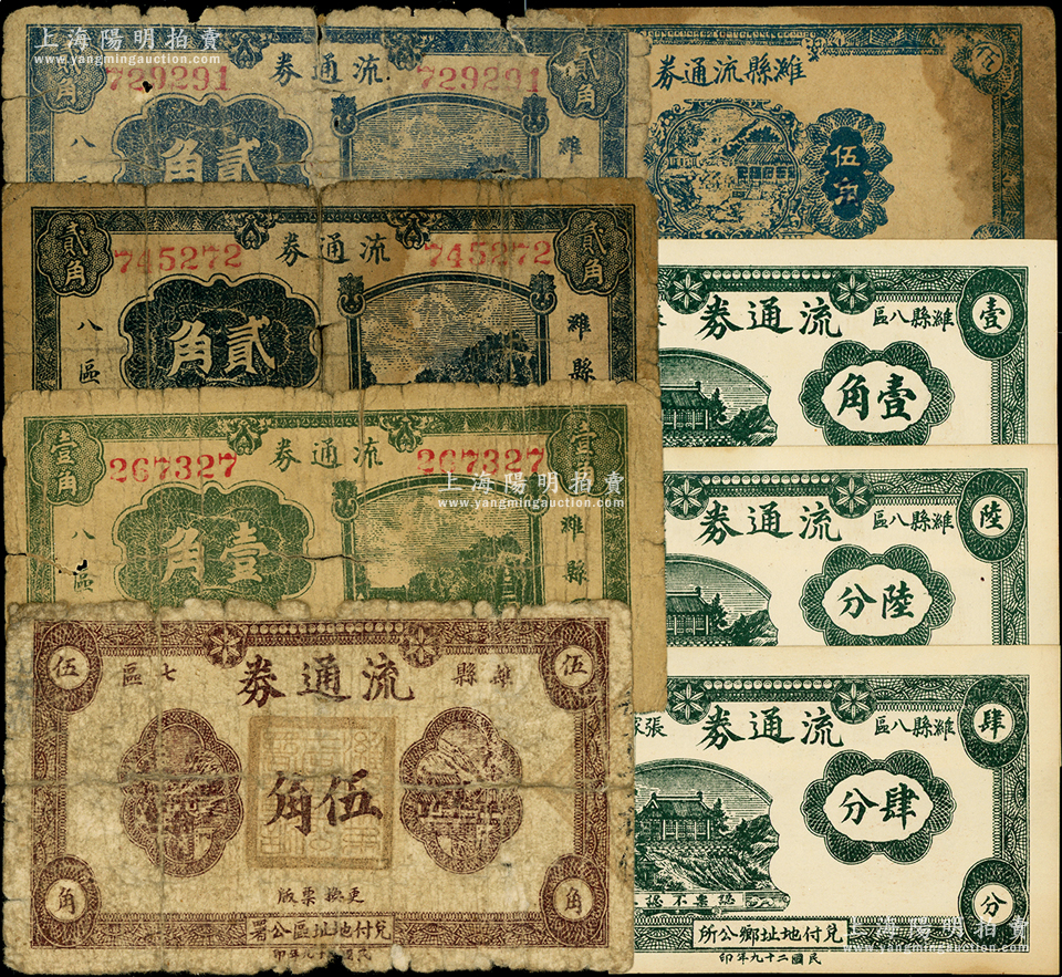 抗战时期潍县地方流通券8枚,详分:潍县七区流通券1940年伍角;潍县八区流通券1940年壹角、贰角2枚;潍县八区张家屯乡流通券1940年肆分、陆分、壹角;潍县流通券1942年伍角;资深藏家出品,破损品至九五成新,敬请预览