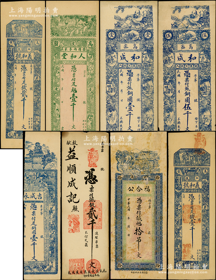 高密县钱票8种,详分:福合公铜元拾吊文;和成铜圆壹千文、伍千文;吉成永铜圆壹千文;人和堂铜元壹千文;义和号足钱壹千文、贰千文;益顺成记1926年贰千文;资深藏家出品,五至九五成新,敬请预览
