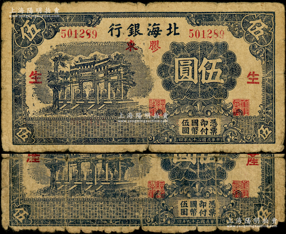 民国二十九年(1940年)北海银行蓝黑色万古长春牌坊图伍圆共2枚全套,胶东地名,分别加印红色“生”和“产”字;张宗彩先生藏品,少见,原票六至七成新