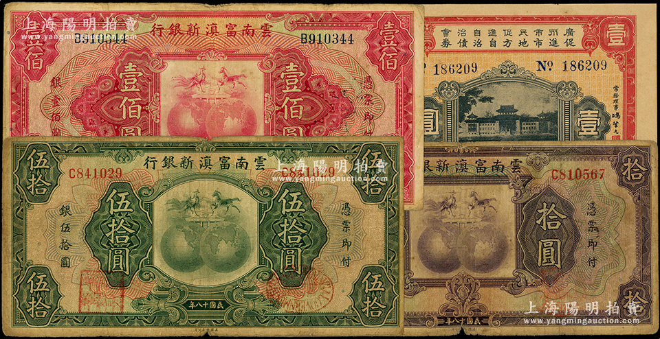 省钞等共4种,详分:云南富滇新银行1929年拾圆、伍拾圆、壹佰圆;广州市民促进自治会促进市地方自治债券1931年壹圆;海外藏家出品,七至八五成新,敬请预览