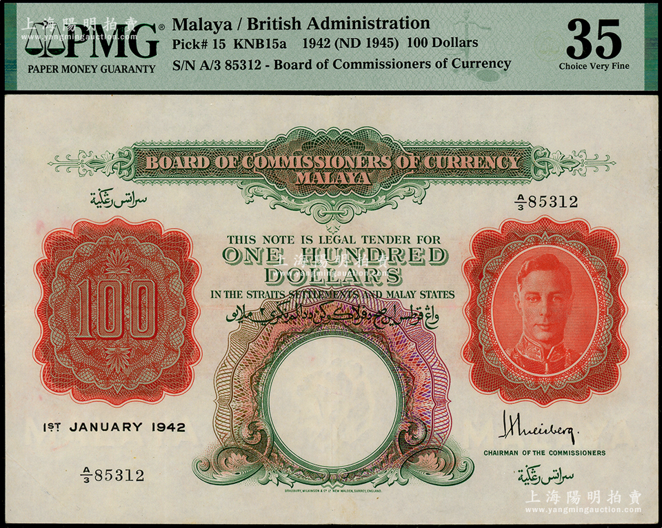 1942年英属马来亚100元,上印乔治六世头像,少见,原票八成新
