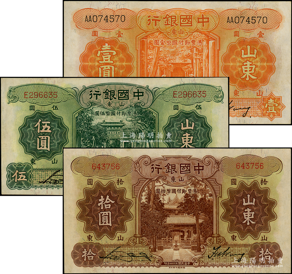 中国银行德纳罗版山东地名券1934年壹圆、伍圆、1935年拾圆共3枚全套,宋汉章·王祖训签名,其中拾圆属无字轨,八五至九成新,敬请预览