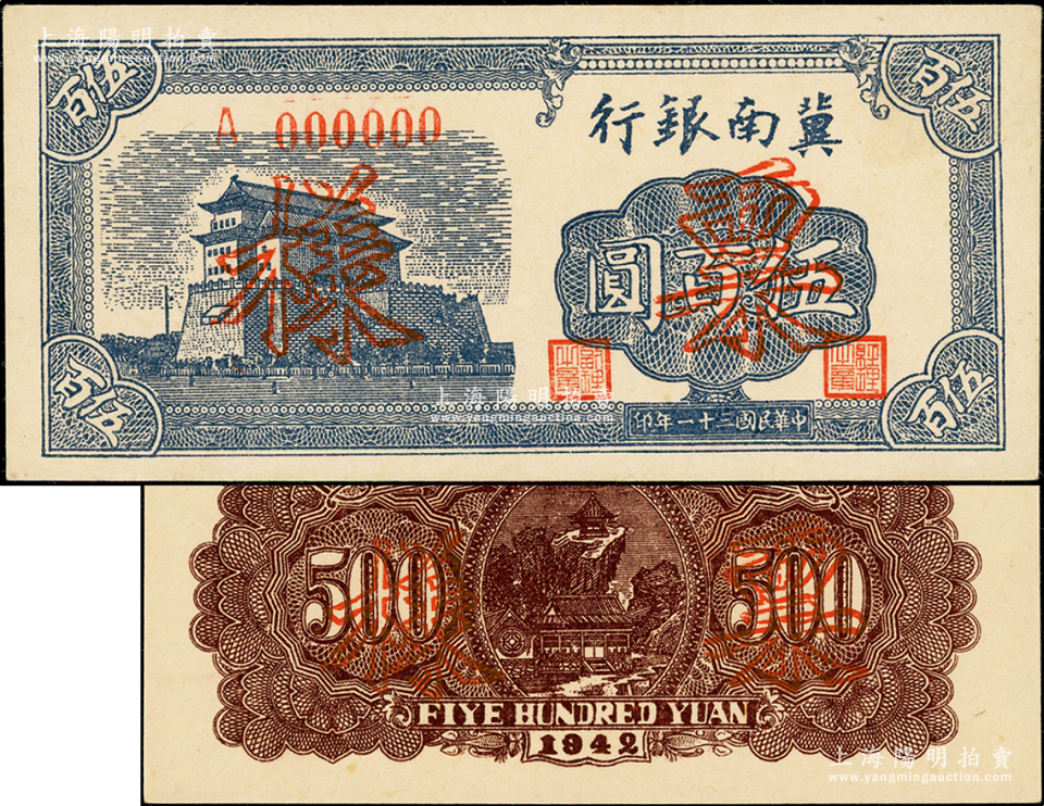 民国三十一年(1942年)冀南银行前门图伍百圆票样,正背共2枚,单A字轨;资深藏家出品,九五至九八成新