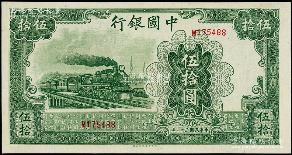 民国三十一年(1942年)中国银行大东版绿火车图伍拾圆,单字轨,九八成新