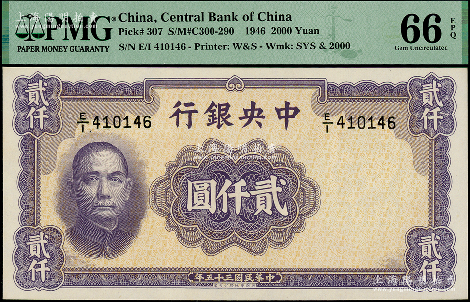 民国三十五年(1946年)中央银行华德路版贰仟圆,海外藏家出品,PMG UNC 66 EPQ
