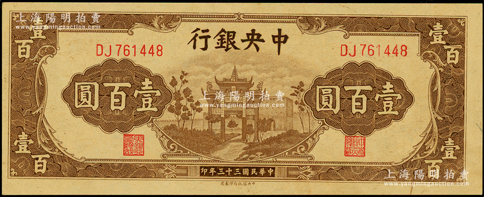 民国三十三年(1944年)中央银行信托版棕色牌坊图壹百圆,海外藏家出品,九八成新