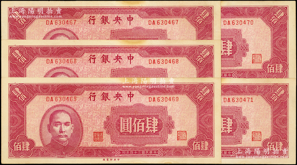 民国三十四年(1945年)中央银行中央厂肆佰圆共5枚连号,八五至九成新