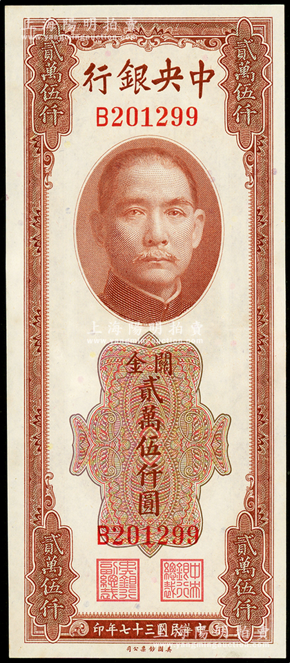 民国三十七年(1948年)中央银行关金美钞版贰万伍仟圆,单字轨;台湾藏家出品,九五成新