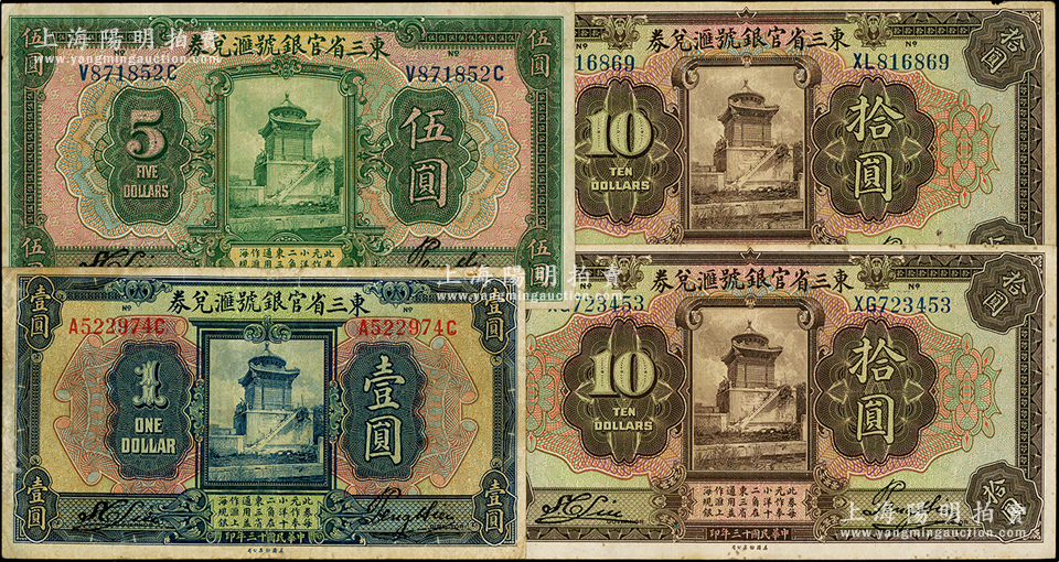 民国十三年(1924年)东三省官银号汇兑券共4枚,内含:壹圆、伍圆各1枚、拾圆共2枚;资深藏家出品,其中2枚源于杭州集钞前辈朱德水先生之旧藏(背面左下角盖有CTS收藏章),原票七至八五成新