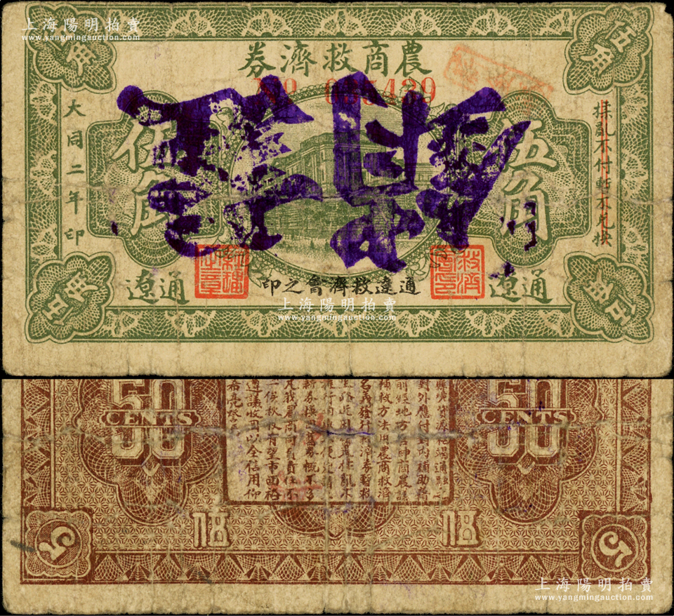 1933年通辽农商救济券伍角,上印房屋图,背印告白文字;1932年1月通辽沦陷,随后东北义勇军第五军高文彬部三次攻入通辽,直至11月战败,随后日寇在当地成立伪政权,发行此种纸币,临时救急金融并收回原义勇军钞票;日本回流品,罕见且未见图谱记载,七成新