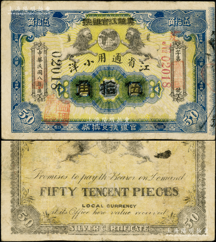 民国八年(1919年)黑龙江官银号·江省通用小洋伍拾角,少见,有修补,近八成新