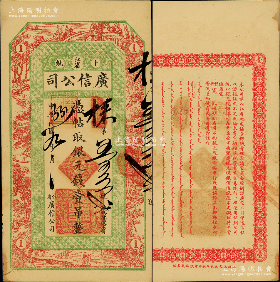 民国九年(1920年)江省·广信公司银元钱壹吊,此为清代沿用版,与光绪或宣统版图文完全相同;海外藏家出品,且为难得之上佳品相,未折九五成新