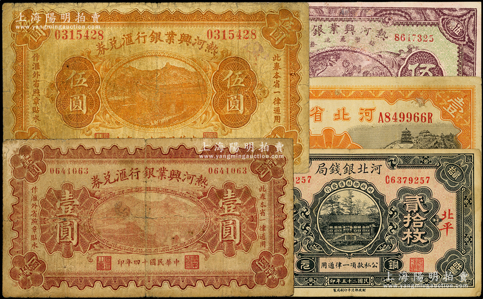 省钞5种,详分:热河兴业银行1925年汇兑券壹圆、伍圆,1927年伍角老假票;河北省银行1934年天津壹圆;河北银钱局1936年北平贰拾枚;七至八成新,敬请预览