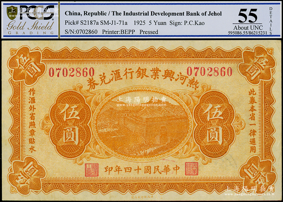 民国十四年(1925年)热河兴业银行汇兑券伍圆,背面为P. C. Kao英文签名,PCGS 55 AU