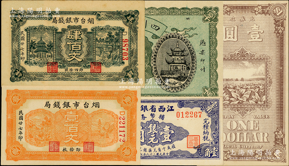 民国纸币5种,详分:烟台市银钱局1938年壹佰文、肆佰文;英美烟公司1922年壹圆;江西省银行1949年银元壹角;四川官钱局1924年制钱壹千文;资深藏家出品,上佳品相,九五至全新