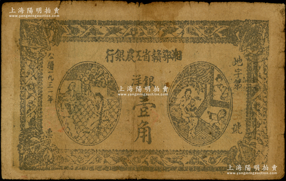 1931年湘鄂赣省工农银行银洋壹角,黑色冠字“地”(通常所见多为“省”字冠),原票七成新