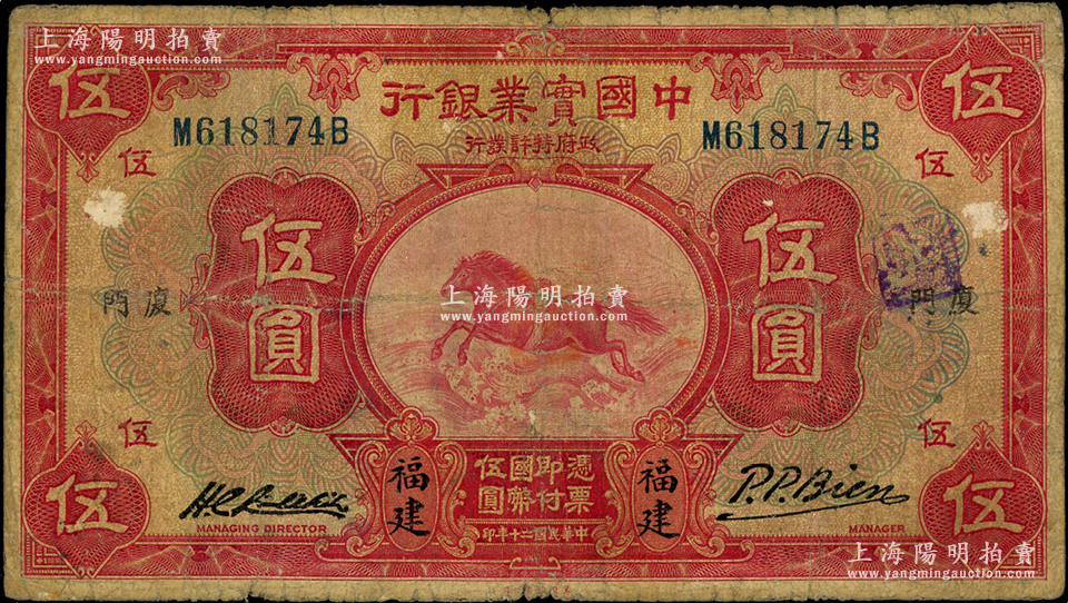 民国二十年(1931年)中国实业银行伍圆,福建·厦门地名,属第一版签名券;源于前辈名家之遗藏,少见,七成新