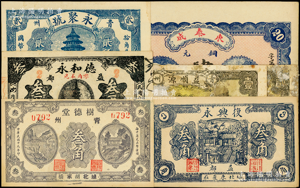 青州(益都)民间钞票7种,详分:东泰成1924年铜元肆佰文;树德堂1930年叁角;德和永1931年叁角;永聚号贰角,益顺源壹角、贰角;复兴永1936年叁角;山东藏家出品,五至九五成新
