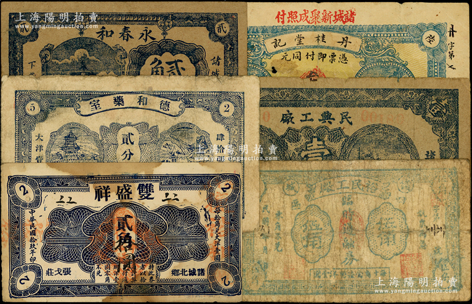 诸城县民间钞票6种,详分:丹桂堂记1926年叁拾枚;双盛祥1930年贰角;德和药室贰分伍、永春和贰角;民兴工厂壹圆;裕民工厂1942年伍角;山东藏家出品,六至八成新