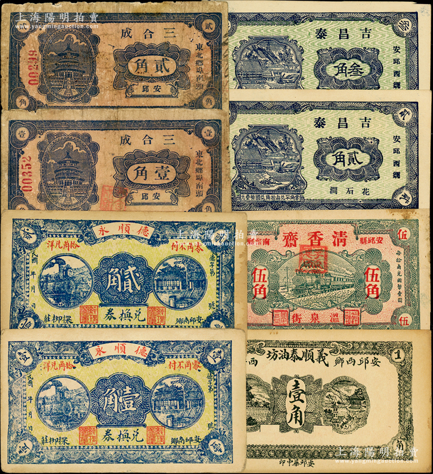 安邱县民间钞票8种,详分:德顺永壹角、贰角;三合成壹角、贰角;义顺泰油坊壹角;清香斋1931年伍角;吉昌泰1938年贰角、叁角;山东藏家出品,七至九成新