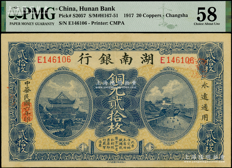 民国六年(1917年)湖南银行铜元贰拾枚,海外藏家出品,PMG 58 AU