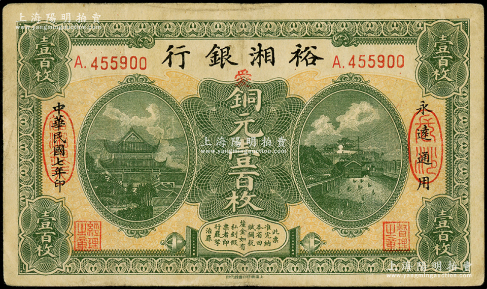 民国七年(1918年)裕湘银行铜元壹百枚,长沙地名,加印红色“爱”字,军阀张敬尧督湘时代发行;台湾藏家出品,八成新