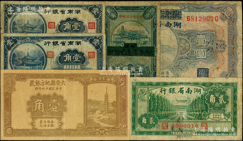 民国省钞6枚,详分:湖南省银行1928年长沙银行改造券壹圆、1938年贰角、1940年壹角2枚;六安县地方银号1930年壹角;徐州平市官钱局改江苏省农民银行1933年贰角;台湾藏家出品,其中1枚有修补,七至八成新,敬请预览