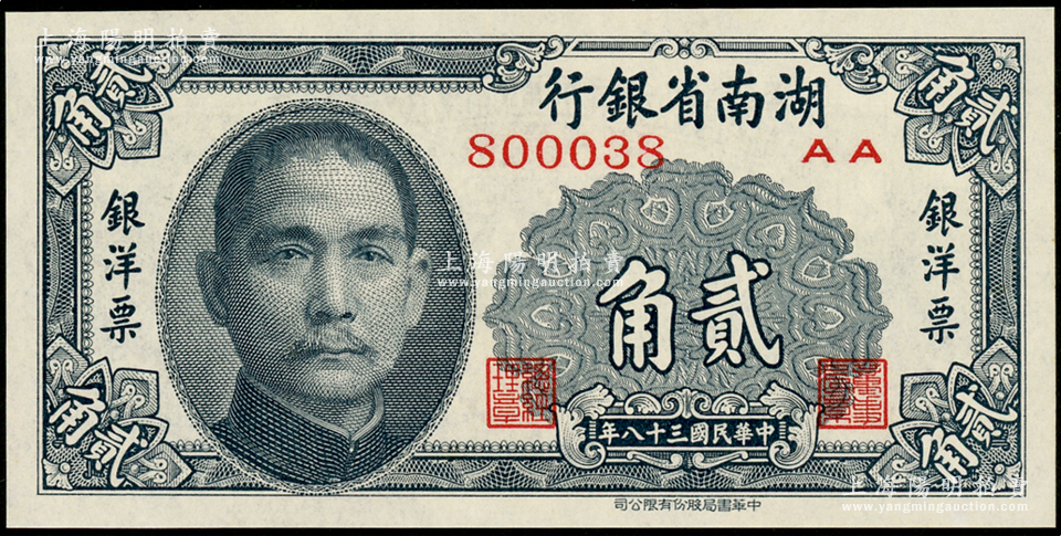 民国三十八年(1949年)湖南省银行中华版银洋票贰角,上印孙中山像,九八成新