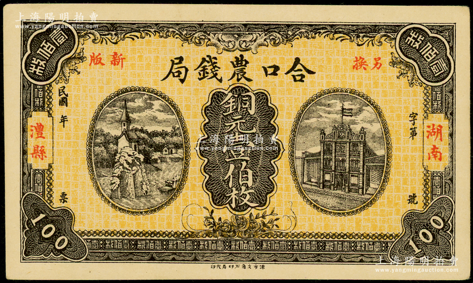民国年(湖南澧县)合口农钱局铜元壹伯枚,背印岳阳楼风景,且有“驻津常汇兑”字样,九成新