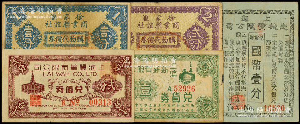 老上海百货业代价券5种,详分:上海新新有限公司兑货券壹分,上海丽华有限公司兑货券贰分,上海先施有限公司兑货券国币壹分,徐家汇商业联谊社购物代价券壹分、贰分,七至八成新