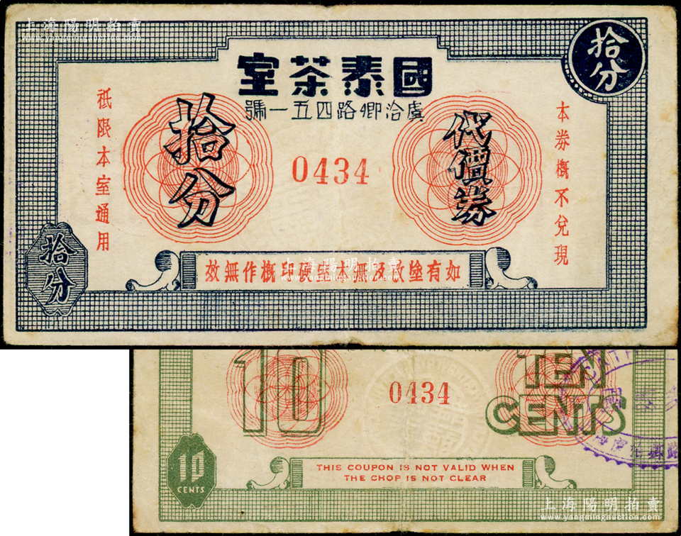 民国(上海虞洽卿路451号)国泰茶室代价券拾分,上盖“国泰舞厅”钢印,属孤岛时期国泰舞厅内“国泰茶室”之代价券;源于著名集钞家吴筹中先生之旧藏,且属《老上海代价券代价币》一书第114页之图片原物,少见,八成新