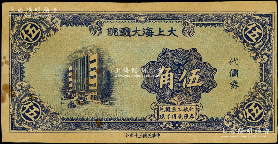 民国三十年(1941年)大上海大戏院代价券伍角,发行于孤岛时期;江南藏家出品,少见,八成新