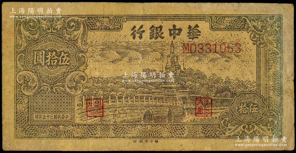 民国三十五年(1946年)华中银行褐色北海图伍拾圆,黄布纹纸印刷,七成新