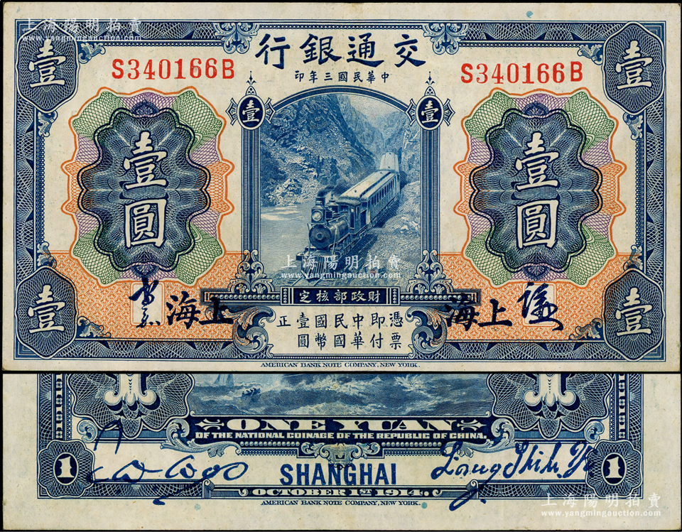 民国三年(1914年)交通银行蓝色壹圆,上海地名,正面中文签章版,背印梁士诒·胡祖同签名;源于前辈名家之遗藏,少见,原票九至九五成新